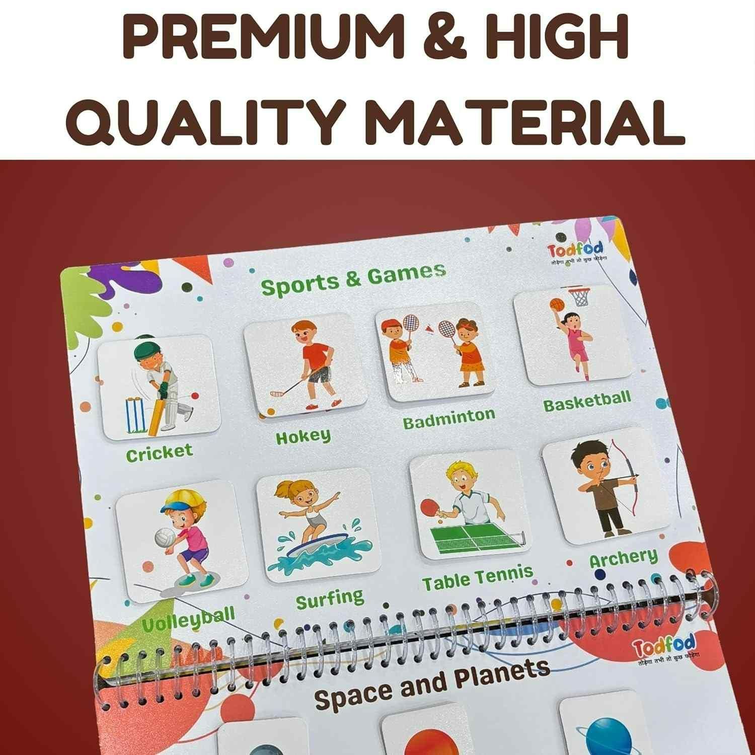 Introduce your little ones to a world of learning with the TodPod Bade Natkhat Educational Learning Book! Designed specifically for children aged 3 years and above, this comprehensive UV-protected Velcro book covers multiple essential topics that make learning engaging and fun. From basic concepts like alphabets, numbers, and colours to exciting subjects such as sports & games, space & planets, and Indian culture, this book offers a well-rounded educational experience.